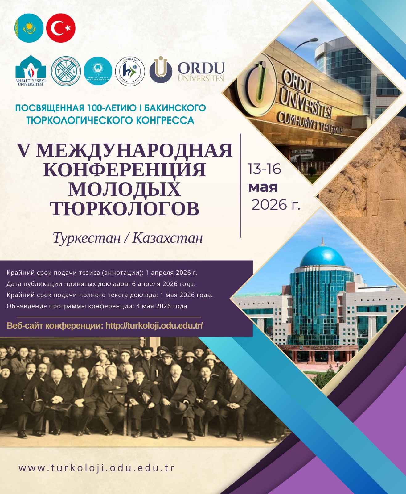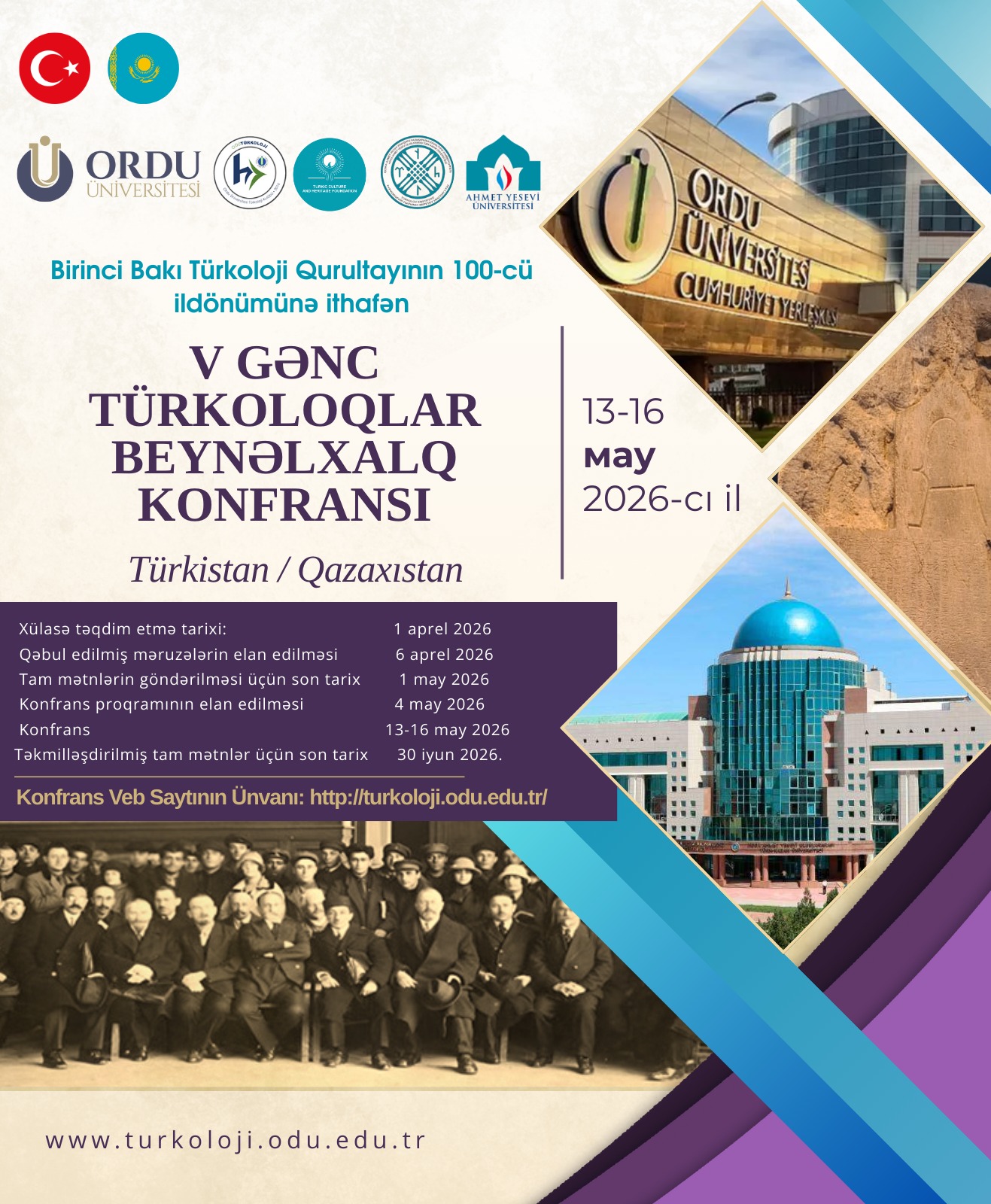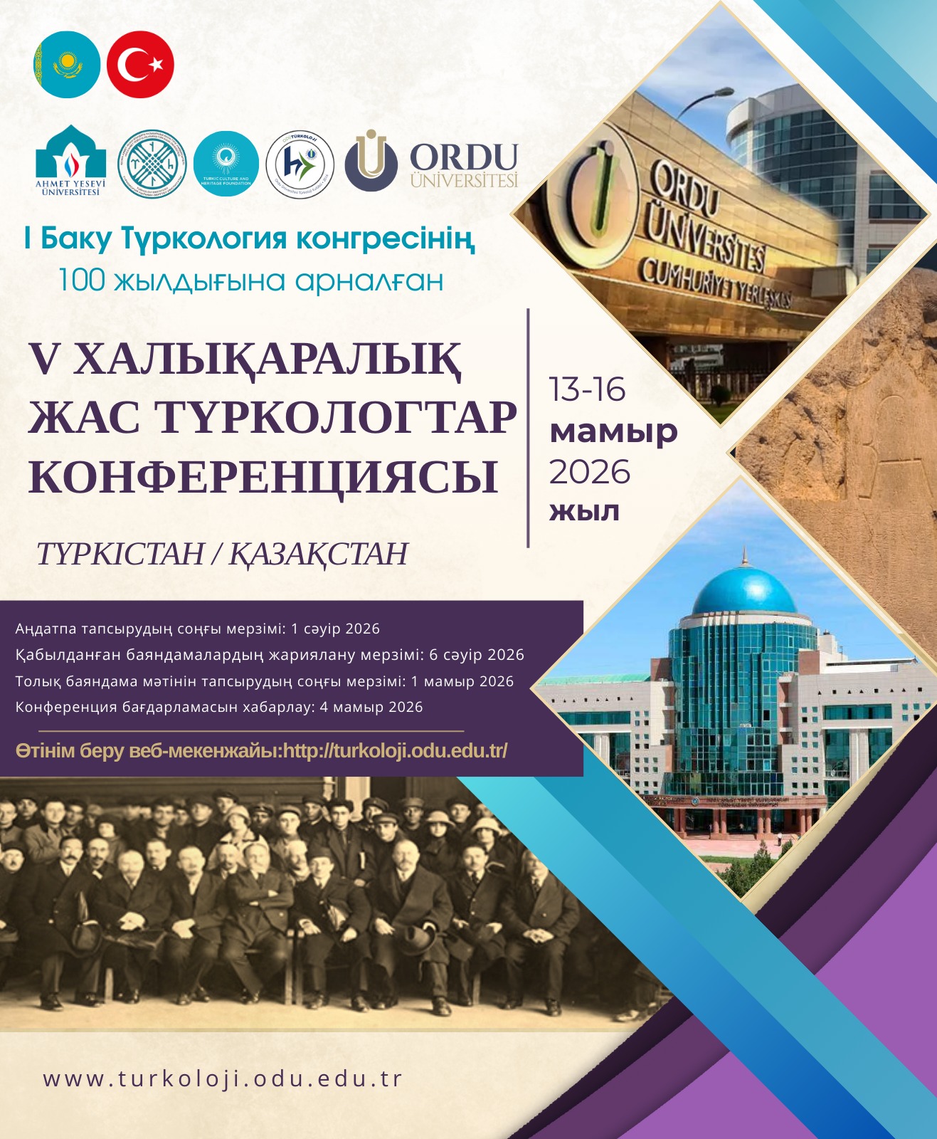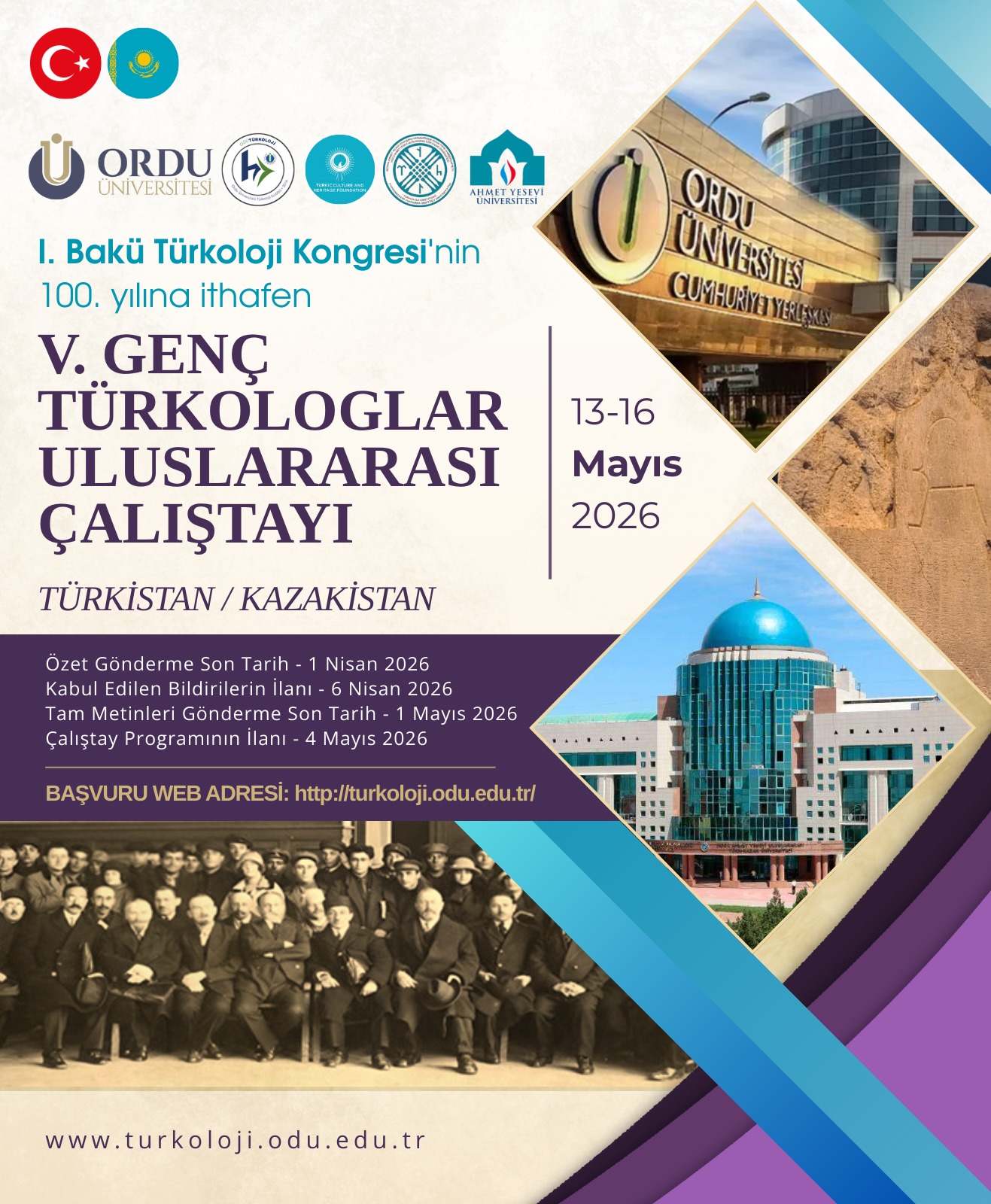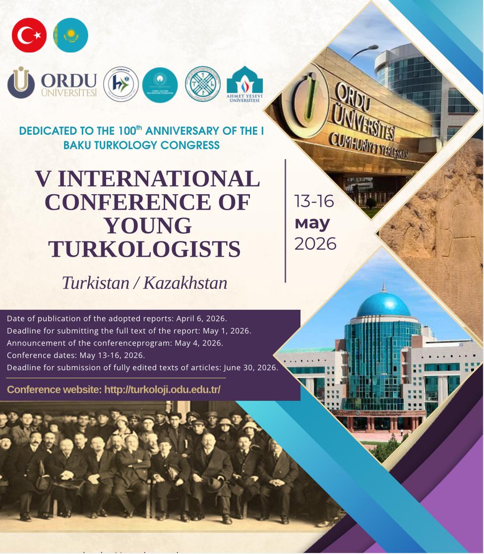 1926 yılında Bakü’de gerçekleşen ve Türk dünyasının dil, edebiyat, sanat, tarih ve kültür esaslı bütünlüğü açısından tarihi bir dönüm noktası olan I. Bakü Türkoloji Kongresi’nin 100. yılı dolayısıyla düzenlenecek olan V. Genç Türkologlar Çalıştayı, 13-16 Mayıs 2026 tarihlerinde Türkistan’da Ordu ÜniversitesiHoca Ahmet Yesevi Uluslararası Türk Kazak Üniversitesi ve Türk Kültür ve Miras Vakfı iş birliğinde yüz yüze katılımlı olarak düzenlenecektir. Çalıştayda uluslararası düzeyde lisans ve lisansüstü öğrencileri Eski Türk dilinden çağdaş Türk yazı dillerine, Eski Türklerin edebiyatlarından çağdaş Türk dünyası edebiyatlarına, Eski Türklerin tarihinden çağdaş Türk dünyası tarihine; Eski Türklerin folklor, sanat ve kültüründen çağdaş Türk dünyası folklor, sanat ve kültürüne Türkolojiyle ilgili pek çok konuda sunacakları bilimsel bildirilerle Türk Dünyasının Manevi Başkenti Türkistan’da bir araya geleceklerdir.
